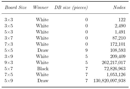 Table 5.7 shows an overview of the result with optimal play on smaller board sizes. What is very interesting in this Figure is that we see that White can win the game on a board which either has horizontal or vertical size equal to 3. But as soon the board gets bigger with both sides at least 5 then White looses his advantage in the majority of cases.